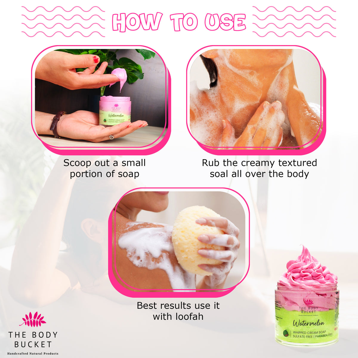 Just scoop a small amount, lather with water or a loofah, and apply to your body. A little goes a long way!