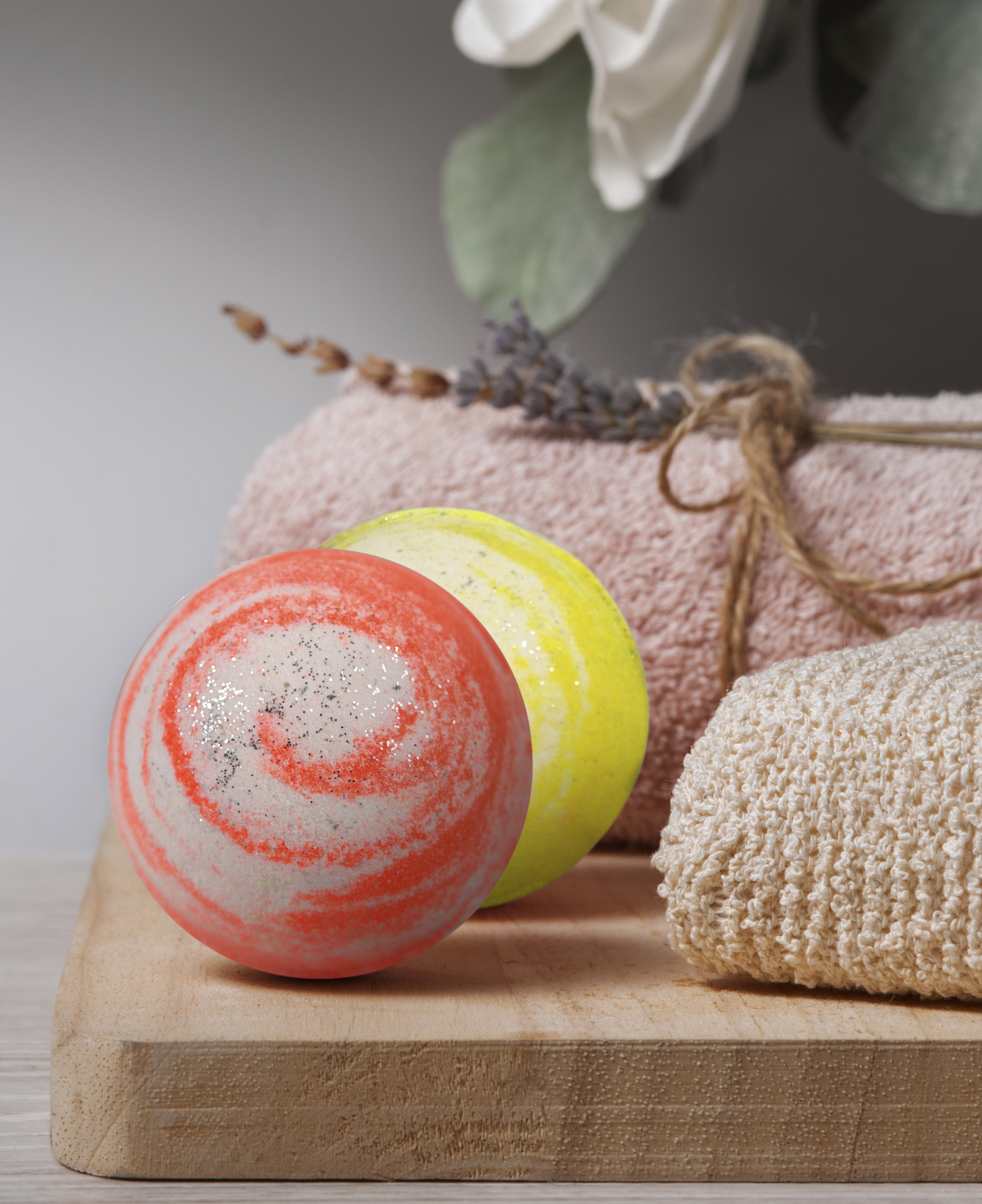 Round swirl relaxing bath bombs with aqua, yalng yalng, orange and lemongrass fragrances(65 gram each)