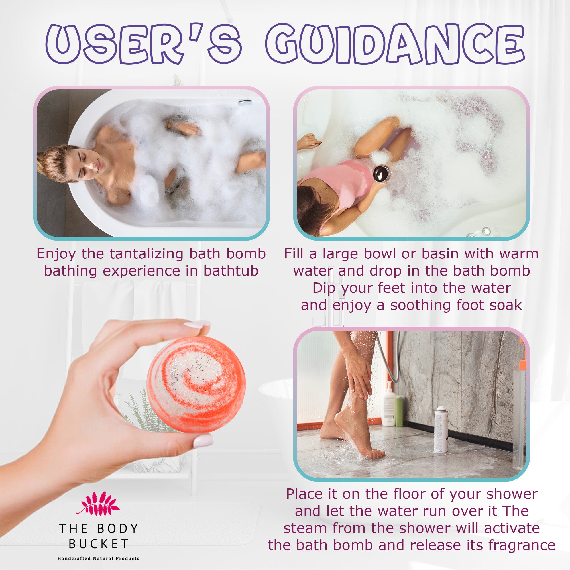 There are 4 pieces of bath bombs. Feed your soul with our heart bath bomb with aqua, yalng yalng, orange and lemongrass relaxing bath bomb of 65 grams each in one box, they all have gorgeous fragrance each bath bomb about 2-inch diameter. You have more choices while you want to enjoy the bubble bath, just choose the one you’d like to use at the moment. We use nature derived and food grade ingredients. We don't use ingredients that we wouldn't use on ourselves or our own children.