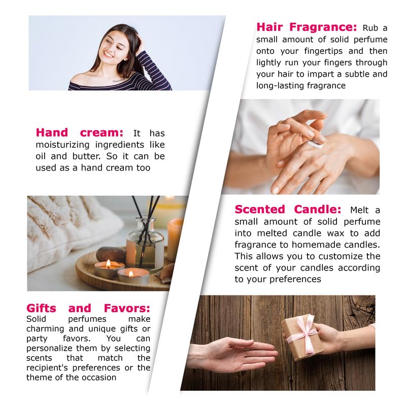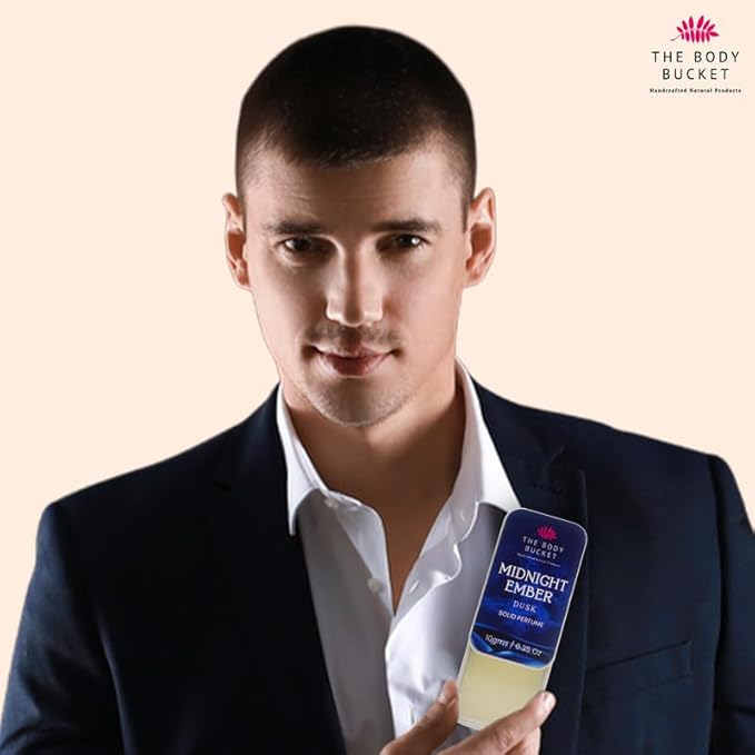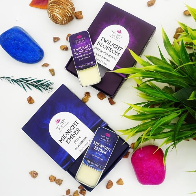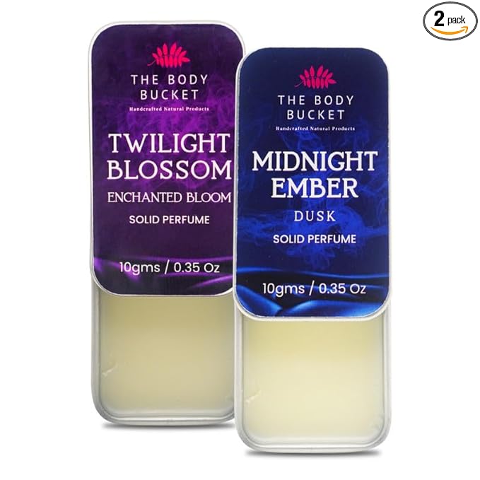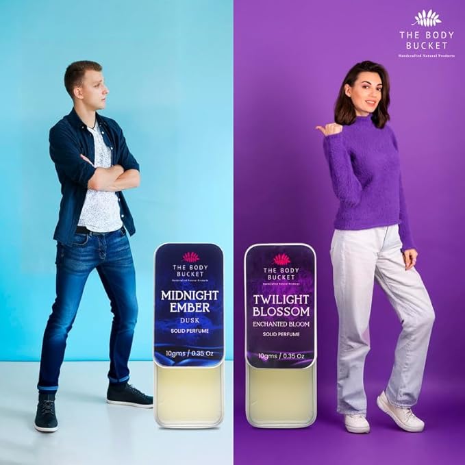 THE BODY BUCKET Solid Perfumes offer two enchanting options: Midnight Ember for men and Twilight Blossom for women. Midnight Ember is crafted with nourishing almond oil, shea butter, beeswax, fragrance oils, and dusk perfume, providing a captivating, long-lasting scent while moisturizing dry, sensitive skin. Twilight Blossom combines almond oil, shea butter, beeswax, and enchanted bloom fragrance to hydrate and soothe, leaving a delightful aroma. Both are alcohol-free, paraben-free, and cruelty-free, making them safe and easy to apply anywhere. Compact and travel-friendly, these solid perfumes are perfect for daily use, whether as a personal fragrance or a hair and room scent, and make thoughtful gifts for any occasion. Enjoy a fresh, captivating scent experience with these versatile and portable balms.