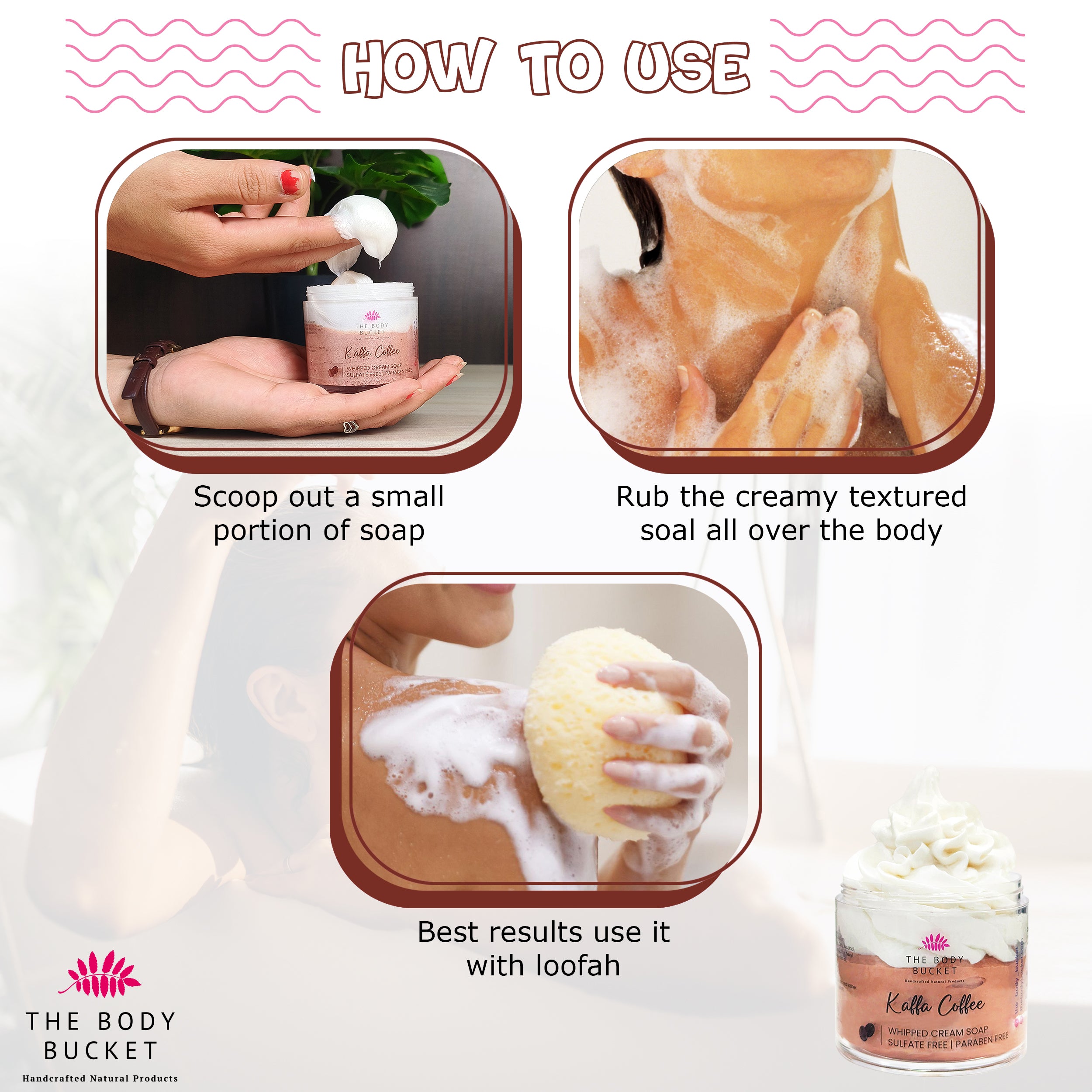 Scoop out a small portion of soap. Wet with water and achieve the desired lather. Apply to your body and wash as usual. For best results use it with loofah.